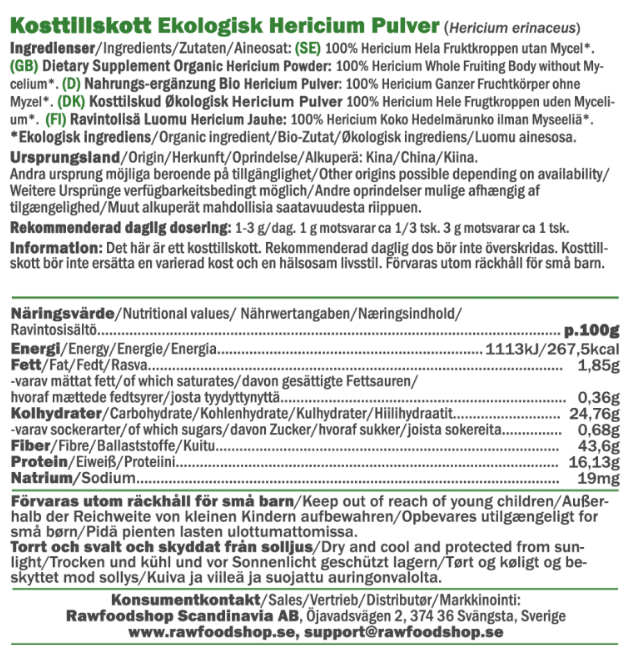 Hericium Pulver/Lion's Mane EKO är ett ekologiskt, veganskt kosttillskott som är enkelt att använda i vardagen. Lion's mane, även kallad igelkottstaggsvamp, är en svamp som trivs på multnande lövträd såsom asp, björk och bok. Dess unika, koralliknande form och fluffiga struktur har gett den smeknamnet "lejonman". Vårt ekologiska Lion's mane-pulver tillverkas med omsorg för att bevara svampens naturliga karaktär, helt utan tillsatser.