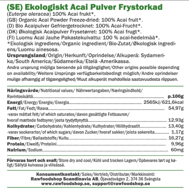 Vårt frystorkade acaipulver är certifierat EU-ekologiskt och helt veganskt, vilket garanterar att du får en produkt som är framställd med omtanke för både dig och planeten. Genom frystorkning bevaras alla acaibärets naturliga smaker, vilket gör detta fruktpulver till en utmärkt råvara i ditt skafferi. Oavsett om du vill skapa en exotisk acai bowl, lyfta smaken på din smoothie eller bara utforska nya smaker, är vårt acaipulver ett riktigt trevligt val.