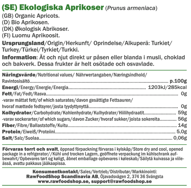 Våra torkade aprikoser är noggrant utvalda och kommer från östra Turkiet, där de får mogna i solens varma strålar. Frukterna skördas omsorgsfullt, urkärnas för hand och torkas på linnehanddukar, vilket bevarar deras naturliga sötma och smak. Då våra aprikoser är osvavlade, har de en brunare färg – ett tecken på deras naturlighet och höga kvalitet. De är ekologiska och råtorkade, vilket innebär att de passar utmärkt i rawfood-livsstilen och veganska rätter.