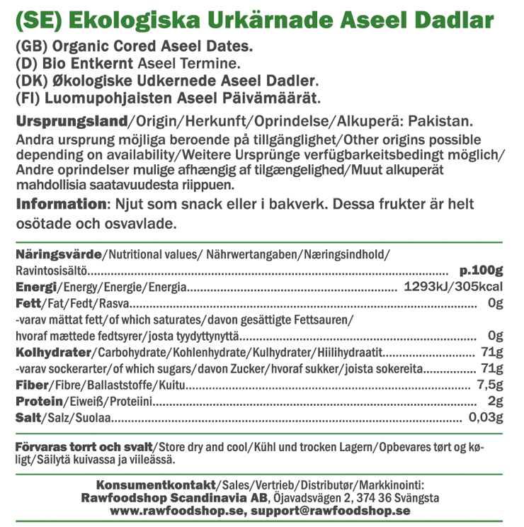 Aseel-dadlar är en delikatess från Pakistan som har blivit populära världen över tack vare sin unika smak och textur. Dessa dadlar, som är kända för sin rika sötma och mjuka konsistens, är mindre i storlek men bär på stora smakerl. I förpackningen Aseel Dadlar urkärnade hittar du råtorkade och veganska Aseel-dadlar, certifierade med EU Organic-märkning för att garantera hög kvalitet. De är ett perfekt naturligt snacks eller ett smakrikt alternativ till socker i bakning.