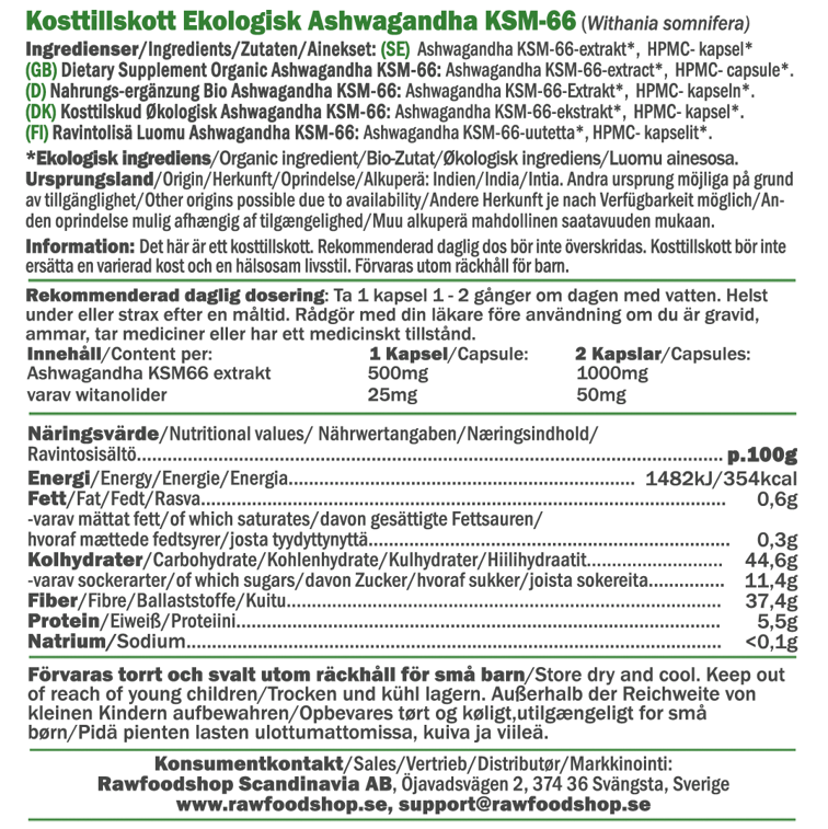 Ashwagandha KSM 66 Extract EKO 500mg är valet för dig som söker ett ekologiskt och växtbaserat kosttillskott. Med ett innehåll av 500 mg ekologisk ashwagandha-extrakt per kapsel, även kallad indisk ginseng, erbjuder denna produkt rena ingredienser framtagen med omsorg. Kapslarna är veganska och tillverkade utan GMO, gluten eller tillsatt socker. Dessutom är de fria från konstgjorda färgämnen, vilket gör dem till ett kosttillskott som passar alla livsstilar.