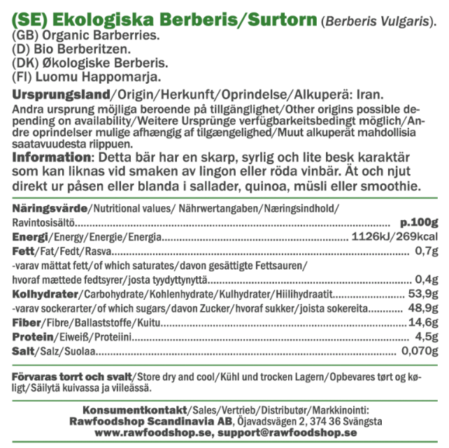 Berberis, även känt som surtorn, är ett litet rött bär med en intensiv syrlig smak som påminner om lingon eller röda vinbär. Denna 100-grams påse innehåller råtorkade, veganska bär av högsta kvalitet, certifierade enligt EU Organic. Berberis är en mångsidig ingrediens som passar utmärkt i både matlagning och bakning, och kan användas både råa och tillagade.