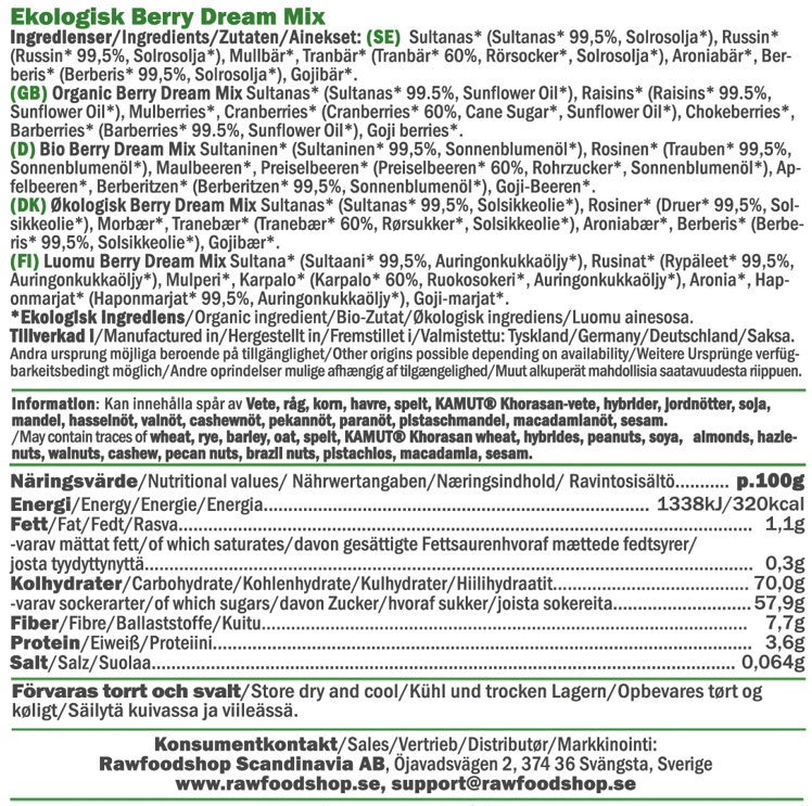 Letar du efter ett smakrikt och naturligt inslag till din vardag? Vår ekologiska bärmix, Berry Dream Mix EKO, är den perfekta lösningen för dig! Denna noggrant utvalda blandning består av sultanrussin, russin, mullbär, tranbär, aronia, berberisbär och gojibär. Tillsammans skapar dessa torkade bär en harmonisk balans mellan söta och syrliga smaker som kommer att förgylla dina måltider och mellanmål.