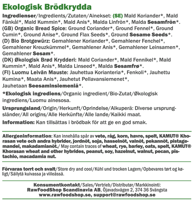Ge dina hembakta bröd en läcker smak med vår ekologiska brödkrydda – en ljuvlig blandning som passar både nybörjare och mer avancerade hemmabagare. Med mald koriander, fänkål, kummin, anis, linfrön och sesamfrön får brödet en rund och fyllig karaktär som känns riktigt hemtrevlig. Vil du baka klassiskt rågbröd eller provar dig fram med glutenfritt bröd? Då kommer den här kryddan att ge ett smakupplevelse som känns i varje tugga. Kryddblandningen är finmald för att enkelt kunna blandas direkt i degen. Den fungerar utmärkt till både kalljästa och snabbjästa degar. Vill du experimentera? Prova att strö lite över ett fröknäcke före gräddning eller rör ner i smeten till ett saftigt morotsbröd. Den passar även utmärkt i hemgjorda brödmixer – ett smart sätt att sätta din egen touch på enkelt, hembakat bröd.