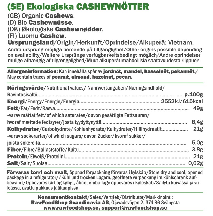 EU Organic-certifieringen säkerställer att produkten är odlad enligt strikta ekologiska riktlinjer, vilket innebär att den är fri från syntetiska bekämpningsmedel och att den produceras med fokus på hållbarhet. Detta gör våra cashewnötter till ett utmärkt val för dig som värdesätter ekologiska produkter av hög kvalitet.