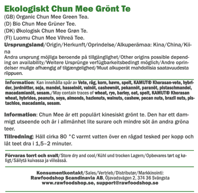 Chun Mee Te EKO är ett klassiskt kinesiskt grönt te som uppskattas världen över för sin unika smak. Namnet, som betyder "dyrbara ögonbryn", syftar på de vackert tvistade bladen som ger teet sitt karakteristiska utseende. Det dammiga ytskiktet på bladen är typiskt för Chun Mee-te och har en robust arome med syrlig ton och lätt sötma. Som ekologiskt odlat grönt te är det ett utmärkt val för dig som vill ha en genuin och smakrik upplevelse i din kopp. Oavsett om du är en van tedrickare eller nyfiken på att utforska fler tesorter, passar detta ekologiska Chun Mee-te perfekt in i en vardag präglad av hållbara och medvetna val.