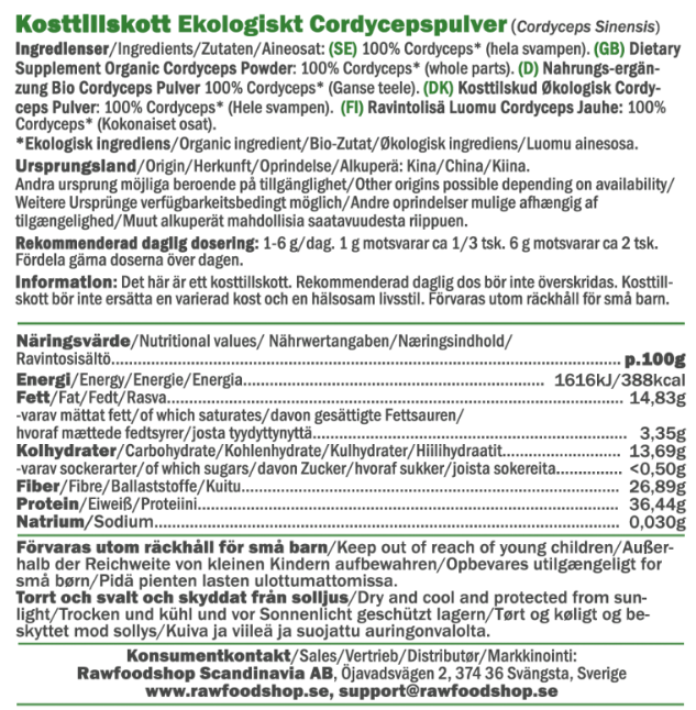 Detta finmalda cordycepspulver kan enkelt blandas i varmt vatten för en smakrik dryck eller tillsättas i smoothies och andra recept. Eftersom det är helt växtbaserat och fritt från tillsatser passar det perfekt som ett veganskt kosttillskott. Vårt ekologiska cordycepspulver är ett smidigt sätt att ta del av denna svamp i en enkel och naturlig form.