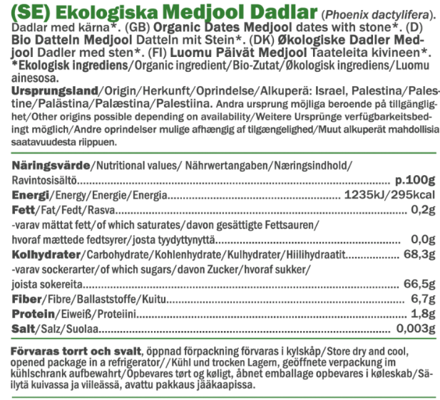 Våra ekologiska Medjool-dadlar är stora, mjuka och lena till konsistensen, vilket gör dem till en återkommande favorit bland dadelsorter. De har länge betraktats som en lyxig pralin och är ofta förknippade med speciella tillfällen. Med sin rika smak och naturliga sötma är de perfekta att njuta av precis som de är, men de fungerar även utmärkt som ett naturligt sötningsmedel i både bakverk och maträtter.