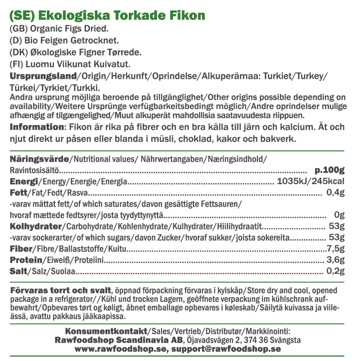 Våra ekologiska torkade fikon från Turkiet är en riktig smakupplevelse. Med sin naturliga sötma och fylliga smak är de en återkommande favorit med en given plats i köket. Certifierade enligt EU Organic-standard, är våra torkade fikon ett råtorkat och veganskt alternativ som du kan avnjuta direkt ur påsen eller använda i en mängd olika recept.