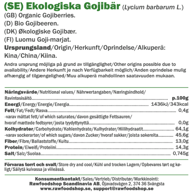 Våra ekologiska gojibär kommer från gojibärsbusken, som växer vilt i Asien. Med sin sötsyrliga smak och knapriga konsistens är gojibär ett populärt val bland dem som uppskattar naturliga smaker. Våra bär är råtorkade för att bevara sin naturliga karaktär och är helt veganska, vilket gör dem till ett utmärkt inslag i det veganska köket.