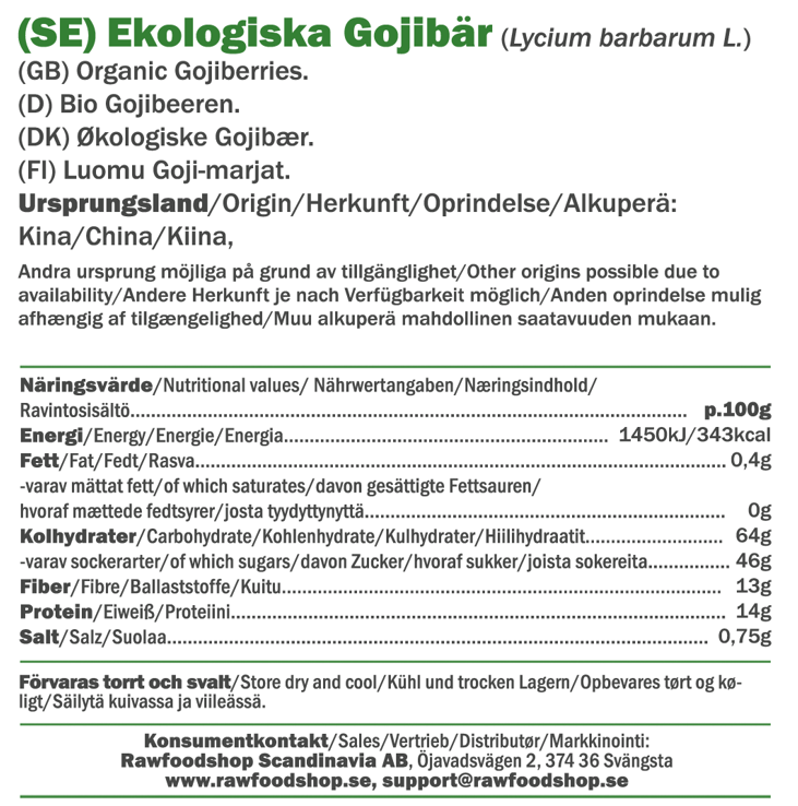 Våra ekologiska gojibär kommer från gojibärsbusken, som växer vilt i Asien. Med sin sötsyrliga smak och knapriga konsistens är gojibär ett populärt val bland dem som uppskattar naturliga smaker. Våra bär är råtorkade för att bevara sin naturliga karaktär och är helt veganska, vilket gör dem till ett utmärkt inslag i det veganska köket.