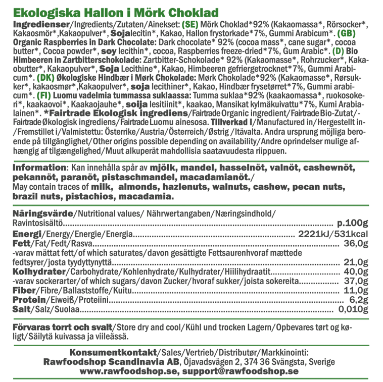 Våra ekologiska frystorkade hallon i mörk choklad är en underbar kombination av syrliga bär och rik, fyllig choklad. De frystorkade hallonen bevarar sin intensiva smak och krispiga textur, medan den mörka chokladen tillför en läcker och mjuk kontrast. Denna delikata mix är helt vegansk och EU-ekologiskt certifierad. Därför är det ett perfekt val för dig som vill njuta av något riktigt gott, samtidigt som du värnar om miljön.