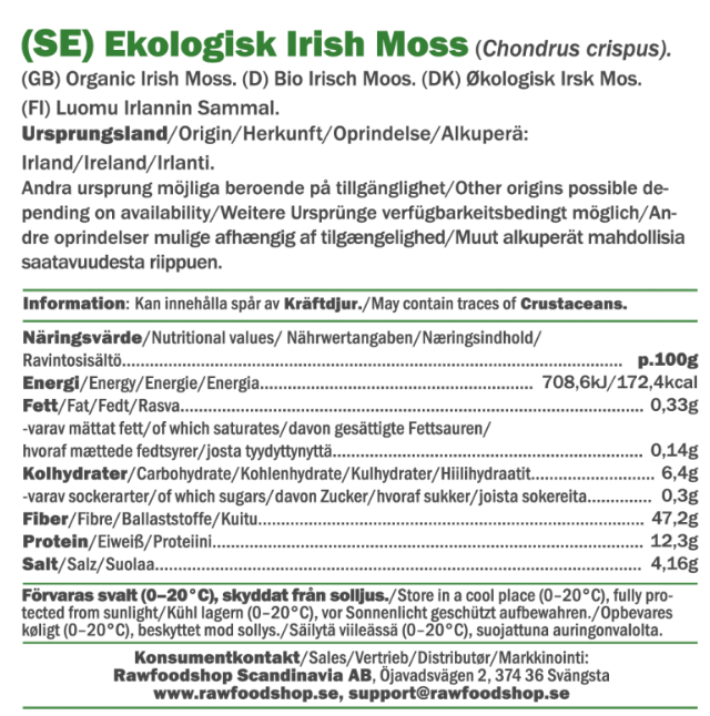Irish Moss, även kallad Chondrus crispus eller irländsk mossa, är en rödalg som växer längs Atlantens kuster och har använts i generationer för sina unika egenskaper. Vår ekologiska Irish Moss kommer direkt från Irland och kan användas både som den är eller för att skapa en geléliknande konsistens i matlagning och bakning. När den kokas bildas ett naturligt slem tack vare sitt innehåll av karagen (E407), vilket gör den till ett perfekt alternativ till gelatin. Dess milda smak kan enkelt sköljas bort, vilket gör den utmärkt i både rawfood-recept och veganska desserter.