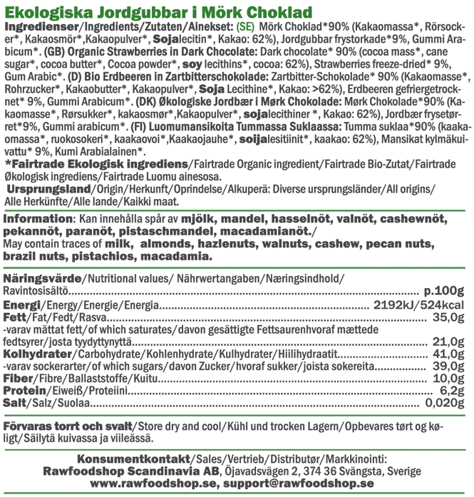 Våra ekologiska jordgubbar i mörk choklad är den perfekta kombinationen av syrliga frystorkade jordgubbar och fyllig, smakrik choklad. Varje bit är noggrant täckt för att ge en smakupplevelse som både förvånar och förtrollar. Denna delikata produkt passar utmärkt för alla som vill njuta av något extra gott – både till vardag och fest.
