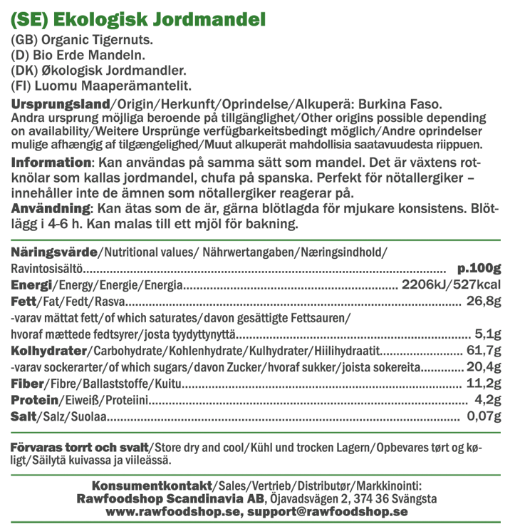 Jordmandeln har en lång och rik historia som sträcker sig tillbaka till det antika Egypten. Idag är den en populär råvara i kök världen över, tack vare sin goda smak och mångsidighet. Våra ekologiska jordmandlar är certifierade enligt EU Organic-standard, vilket innebär att de har odlats utan syntetiska bekämpningsmedel och under hållbara förhållanden.