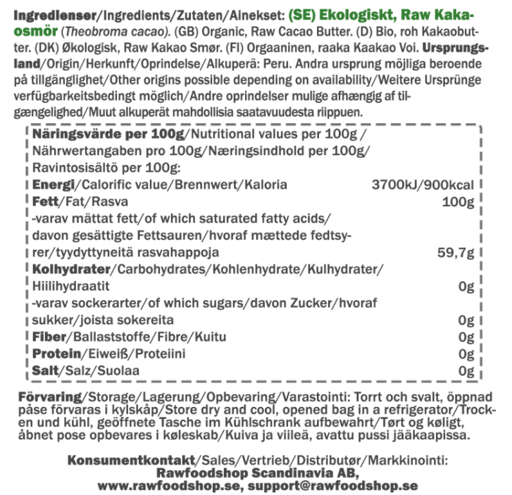 Kakaosmör EKO är en ren olja utvunnen ur kakaobönan och har en rik, fyllig chokladarom. Den fasta konsistensen smälter vid kroppstemperatur och gör det enkelt att använda både i matlagning och hudvård. I köket kan du använda kakaosmör för att ge en silkeslen textur och en fyllig smak till smoothies, desserter, glass och hemlagade chokladkreationer. Det är en oumbärlig ingrediens för alla som älskar att experimentera med naturliga och smakrika råvaror.
