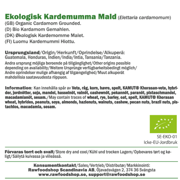 Ekologisk mald kardemumma är en krydda med en varm och aromatisk smak som används världen över i matlagning och bakning. Den finmalda konsistensen gör den enkel att använda i allt från bakverk till drycker. Ursprungligen från Sydostasien är kardemumma en av världens mest uppskattade kryddor och en oumbärlig del av många traditionella recept.