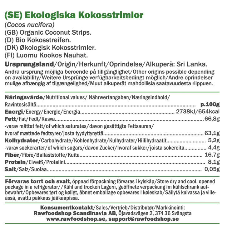 Våra kokosnöts strimlor är certifierade enligt EU Organic-standarden, vilket innebär att de är framställda utan syntetiska bekämpningsmedel eller konstgödsel. När du väljer våra strimlor, väljer du en produkt som är både ekologisk och hållbart producerad. Certifieringen är en garanti för att du får en produkt av högsta kvalitet, odlad med omtanke om både dig och miljön.