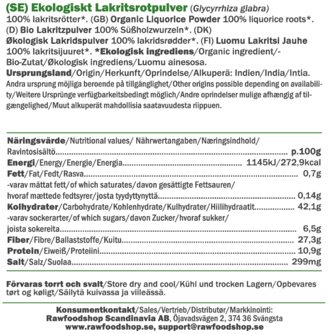 När du väljer vårt Lakritsrotpulver EKO, får du inte bara en produkt av högsta kvalitet, utan också tryggheten i att den är helt ekologisk. Det innebär att lakritsroten odlats utan konstgjorda bekämpningsmedel eller tillsatser, vilket gör den till ett medvetet val för dig som prioriterar rena råvaror. Förpackningen på 125g är perfekt för både den flitiga hemmabagaren och matälskaren som vill experimentera med nya recept. Ge dina rätter en extra dos karaktär – låt lakritsrotpulvret bli din nya favorit i köket!