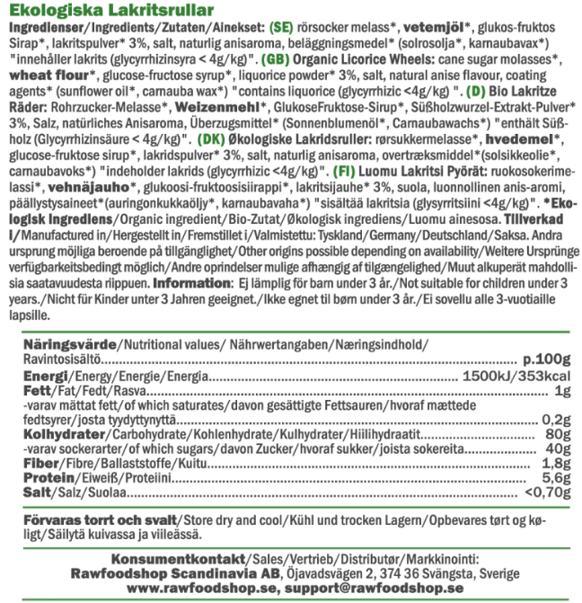 | Näringsvärden: | Ingredienser/Ingredients/Zutaten/Ainekset: (SE) Ekologiska Lakritsrullar rörsocker melass*, vetemjöl*, glukos-fruktos sirap*, lakritspulver* 3%, salt, naturlig anisaroma, beläggningsmedel* (solrosolja*, karnaubavax*) "innehåller lakrits (glycyrrhizinsyra < 4g/kg)". (GB) Organic Licorice Wheels cane sugar molasses*, wheat flour*, glucose-fructose syrup*, liquorice powder* 3%, salt, natural anise flavour, coating agents* (sunflower oil*, carnauba wax*) "contains liquorice (glycyrrhizic <4g/kg) ". (D) Bio Lakritze Räder Rohrzucker-Melasse*, Weizenmehl*, GlukoseFruktose-Sirup*, Süßholzwurzel-Extrakt-Pulver* 3%, Salz, natürliches Anisaroma, Überzugsmittel* (Sonnenblumenöl*, Carnaubawachs*) "enthält Süßholz (Glycyrrhizinsäure < 4g/kg)". (DK) Økologiske Lakridsruller rørsukkermelasse*, hvedemel*, glucose-fruktose sirup*, lakridspulver* 3%, salt, naturlig anisaroma, overtræksmiddel* (solsikkeolie*, carnaubavoks*) "indeholder lakrids (glycyrrhizic <4g/kg)". (FI) Orgaaniset Lakritsi Pyörät ruokosokerimelassi*, vehnäjauho*, glukoosi-fruktoosisiirappi*, lakritsijauhe* 3%, suola, luonnollinen anis-aromi, päällystysaineet*(auringonkukkaöljy*, karnaubavaha*) "sisältää lakritsia (glysyrritsiini <4g/kg)". * Ekologisk ingrediens/Organic ingredient/Bio-Zutat/Økologisk ingrediens/Orgaaninen ainesosa. | Ursprungsland/Origin/Herkunft/Oprindelse/Alkuperå: Tyskland/Germany/Deutschland/Saksa. | | Information/Tiedot: (SE) Ej lämplig för barn under 3 år. (GB) Not suitable for children under 3 years. (D) Nicht geeignet für Kinder unter 3 Jahren. (DK) Ikke egnet til børn under 3 år. (FI) Ei sovellu alle 3-vuotiaille lapsille. | | Näringsvärde per 100g/Nutritional values per 100g / Nährwertangaben pro 100g/Næringsindhold per 100g/ Ravintosisältö per 100g: | | Energi/Calorific value/Brennwert/Energiaa: | 1500kJ/353kcal | | Fett/Fat/Fedt/Rasvaa: | 1g | | -varav mättat fett/saturated fatty acids/gesättigte Fettsauren/mættede fedtsyrer/tyydyttyneitä rasvahappoja: | 0,2g | | Kolhydrater/Carbohydrates/Kohlenhydrate/Kulhydrater/ Hiilihydraatteja: | 80g | | -varav sockerarter/of which sugar/davon Zucker/ hvoraf sukker/joista sokereita: | 40g | | Fiber/Fibre/Ballaststoffe/Kuitu: | 1,8g | | Protein/Eiweiß/Proteiinia: | 5,6g | | Salt/Salz/Suolaa: | <0,70g | | Förvaring/Storage/Lagerung/Opbevaring/Varastointi: Torrt och svalt/Dry and cool/Trocken und kühl/Tørt og køligt/Kuiva ja viileä. | |