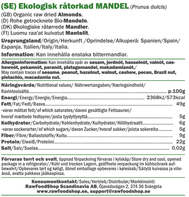 Mandel är en älskad ingrediens i kök världen över, känd för sin mångsidighet och milda, nötiga smak. Vare sig du vill baka glutenfritt, skapa smakrika desserter, eller bara njuta av dem som de är, passar mandeln perfekt. Våra mandlar är av högsta premiumkvalitet, noggrant utvalda för att ge dig den bästa smaken och knaprigheten. Ekologiska och certifierade enligt EU Organic-standard.