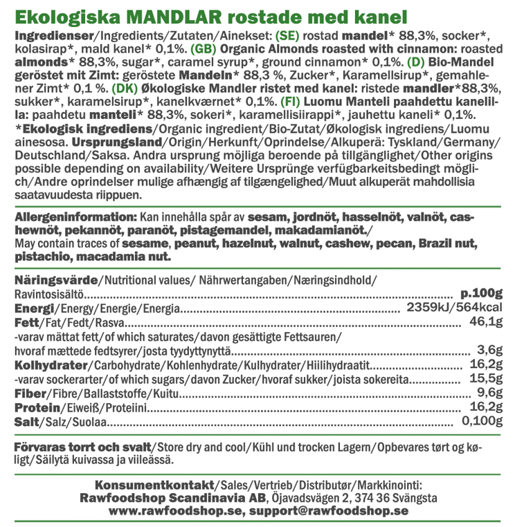 De ekologiska mandlarna är noggrant utvalda för att garantera högsta kvalitet och bästa smak. Varje mandel rostas varsamt för att få fram dess naturliga krispighet, och den tillsatta kanelen ger en mjuk sötma med en kryddig twist. Det är ett snacks som känns både lyxigt och naturligt, ett perfekt val för dig som söker ett smakrikt och ekologiskt alternativ i vardagen.