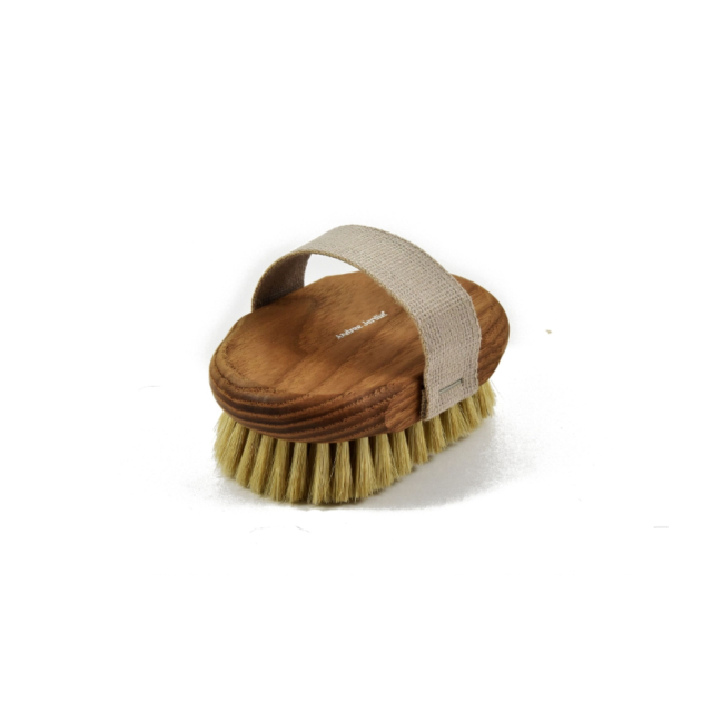 Massageborste Askträ är en handtillverkad massageborste i naturmaterial från Frankrike, designad för både massage och skonsam peeling. Den värmebehandlade askens rika chokladbruna ton ger inte bara en elegant look, utan gör även borsten mer motståndskraftig mot vatten och fukt. Med sin generösa storlek, naturliga fibrer och praktiska vävda rem är den ett perfekt redskap för torrmassage och naturlig hudvård i vardagen.