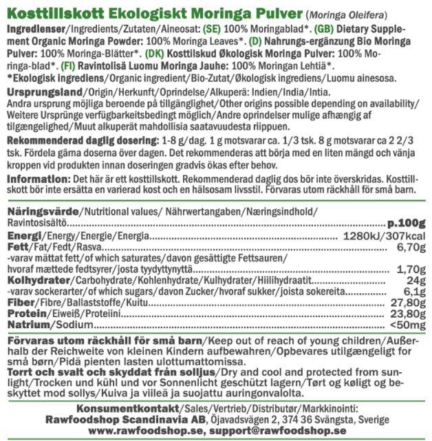 Moringa Pulver EKO är ett ekologiskt kosttillskott som har blivit en favorit bland alla som uppskattar vegansk matlagning och hållbara vardagsval. Med sin djupa gröna färg och milda jordiga smak är moringa-pulver perfekt att blanda ner i smoothies, juicer eller soppor utan att ta över smaken från övriga ingredienser. Du kan till och med använda pulvret som ett naturligt färgämne i bakverk eller dressingar för att ge maten en extra färgklick.