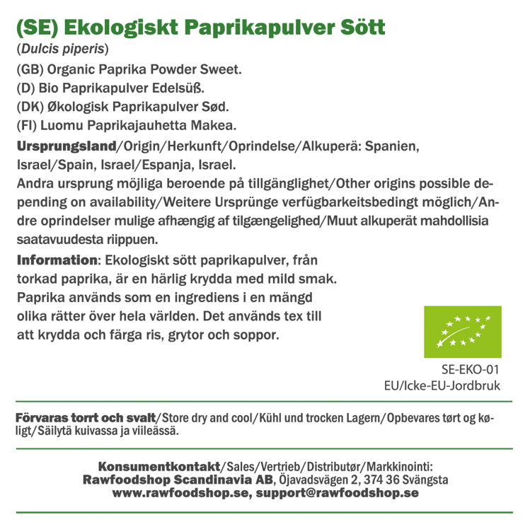 Prova vårt ekologiska paprikapulver med mild och rund smak som passar perfekt i både vardagsmat och festliga måltider. Det här är kryddan som du alltid vill ha nära till hands. Paprikapulver används världen över för att ge färg, djup och smak till allt från risrätter och soppor till grytor och tomatbaserade rätter. I det ungerska köket är det en självklarhet i gulasch, och i det spanska köket är paprikapulver ofta en nyckelingrediens i paella. Detta paprikapulver är ekologiskt odlat och varsamt råtorkat, vilket ger en hög kvalitet och en naturligt rik smakupplevelse.