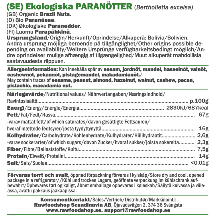 Att välja ekologiska paranötter innebär att du får en produkt som är fri från kemiska bekämpningsmedel och konstgödsel, vilket bland annat är bättre för miljön och klimatet. Den ekologiska skörden bidrar till att bevara de unika ekosystemen i Sydamerikas regnskogar, där träden kan växa naturligt. Att äta rawfood, som våra paranötter, innebär att bevara råvarans karaktär och naturlig smak som annars kan gå förlorad vid upphettning. Genom att inkludera råa paranötter i din kost får du en ren, oförädlad ingrediens som stödjer din rawfood-livsstil.