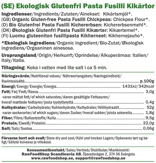 Pasta Fusilli Kikärtor EKO är det smarta valet för dig som vill laga goda, naturliga måltider utan gluten. Denna ekologiska kikärtspasta består av en enda ingrediens – ekologiskt kikärtsmjöl. Det gör den till ett självklart val för dig som vill undvika onödiga tillsatser. Fusilli-formen är perfekt för att fånga upp såser och passar utmärkt i både kalla och varma rätter. Med sin fasta textur och naturliga smak blir denna glutenfria fusilli ett utmärkt alternativ till traditionell pasta. Särskilt för dig som söker nya idéer till veganska recept eller vill testa en ny typ av kikärtspasta.