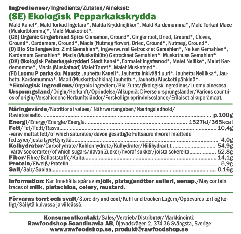 Här får du en ekologisk kryddblandning som ger dina bakverk den klassiska smaken av pepparkaka. Med en perfekt mix av kanel, kryddnejlikor, kardemumma, muskotblomma och muskotnöt får du en smakrik krydda som lyfter allt från mjuk pepparkaka till klassiska småkakor. Det här är en pepparkakskrydda som passar både till traditionellt julbak och moderna recept, oavsett om du vill baka glutenfritt eller baka veganskt. Denna ekologiska kryddblandning är perfekt för dig som vill skapa smakrika bakverk med naturliga råvaror. Du kan även enkelt använda den i smoothies, granola, fil, yoghurt eller varma drycker som chailatte. Perfekt när du vill få till den där typiska pepparkakssmaken på ett enkelt och smidigt sätt.