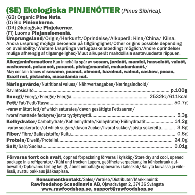 Dessa pinjenötter är inte bara en smakfull ingrediens, de är också ett ansvarsfullt val. De är ekologiskt certifierade, vilket betyder att de har producerats utan konstgjorda bekämpningsmedel eller kemikalier. Den ekologiska odlingen bidrar till ett mer hållbart jordbruk. Pinjenötterna är dessutom helt veganska, vilket gör dem till ett utmärkt alternativ för dig som vill välja bort animaliska produkter. Att välja ekologiska och veganska produkter är inte bara ett trevligt inslag i din matlagning, det är även ett val som bidrar till en bättre framtid.