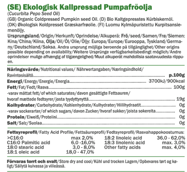 Vår kallpressade pumpafröolja är en naturlig och ekologiskt framställd vegetabilisk olja med en djupgrön färg och fyllig, nötig smak. Tack vare att den är kallpressad bevaras den karakteristiska smaken från pumpafröna på bästa sätt. Den här typen av olja är särskilt känslig för värme och bör därför användas i kalla rätter – perfekt i sallader, marinader, eller som en smakrik topping på soppor. Även i bakning bidrar pumpafröolja med en spännande smakupplevelse. Ett enkelt sätt att lyfta hemmets matupplevelser med ett ekologiskt val. För bästa hållbarhet rekommenderas att förvara oljan i kylskåp eller ett svalt skafferi. Den mörka flaskan hjälper till att skydda innehållet från ljus och bevarar smaken längre.