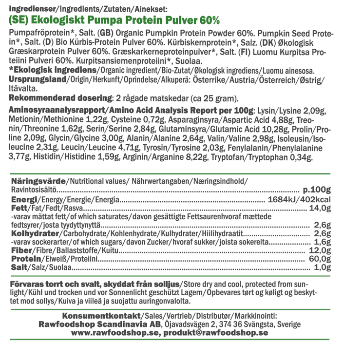 Det här växtbaserade proteinpulvret passar för alla som söker ett smakrikt och läckert alternativ till traditionella proteinpulver. Dess fina konsistens gör det lätt att blanda i både varma och kalla rätter. Prova det i proteinpannkakor, energibars eller en härlig smoothie för en god start på dagen. Oavsett om du har en aktiv livsstil eller bara vill tillföra mer växtbaserat protein till din kost, är Pumpaprotein 60% EKO ett utmärkt val.