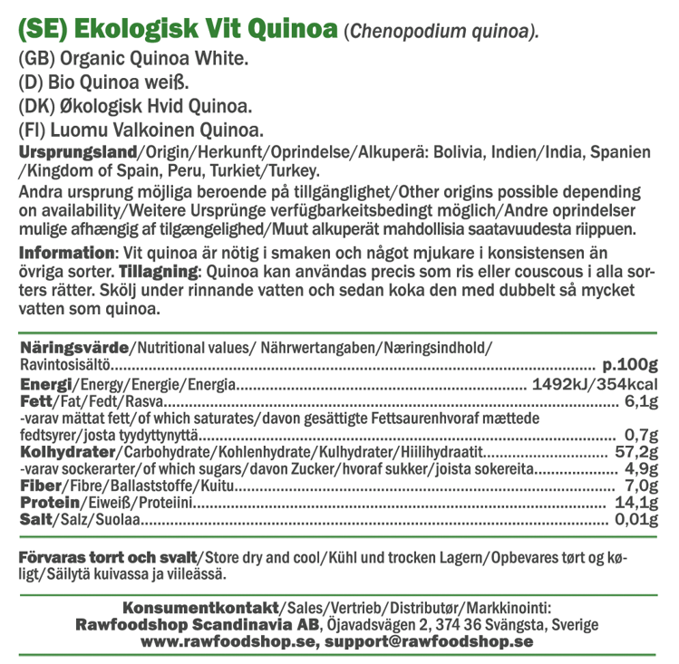 Quinoa Vit EKO är det perfekta valet för dig som vill njuta av en lätt och behaglig konsistens med en mild nötaktig smak. Denna ekologiska vit quinoa kan användas i en mängd olika rätter och fungerar utmärkt som ett näringsrikt alternativ till ris eller pasta. Ursprungligen från Sydamerika, har quinoa odlats i över 7000 år och uppskattas idag världen över för sin mångsidighet i matlagning. Vill du laga en smakrik sallad, en mustig gryta eller en krämig quinoagröt till frukost? Då är vit quinoa ett utmärkt val.