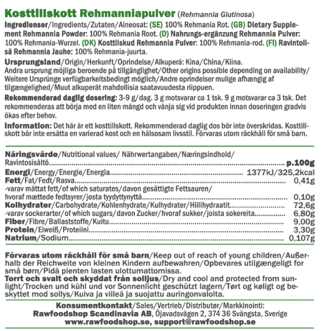 Vårt rehmannia-pulver är ett veganskt kosttillskott och tillverkat av 100% rehmannia-rot (Rehmannia glutinosa) och ingenting annat – rent, enkelt och helt växtbaserat. För dig som söker ett veganskt kosttillskott med naturligt ursprung passar detta pulver perfekt in i en vardag där rawfood, ekologiska alternativ och vegansk matlagning står i fokus. Pulvret är lätt att dosera och kan tillsättas i allt från smoothies och teer.