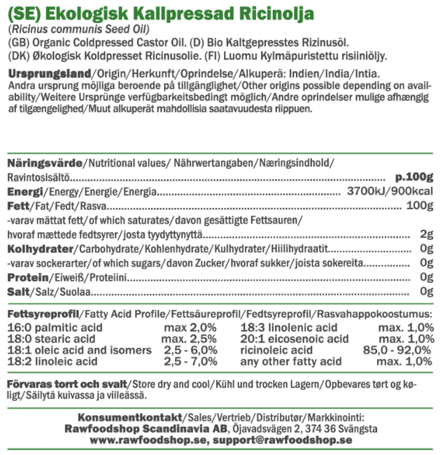 Ricinolja är en uppskattad ingrediens inom naturlig hudvård tack vare sin unika sammansättning och karaktäristiska textur. Den kallpressade ekologiska varianten utvinns varsamt för att bevara oljans naturliga egenskaper. Eftersom oljan har en tjock, trögflytande och lätt klibbig konsistens, absorberas den inte direkt av huden, vilket gör den perfekt i massageoljor och rengöringsprodukter där du vill ha arbeta längre med oljan. Ricinolja kan även blandas med andra vegetabiliska basoljor för att uppnå önskad konsistens och funktion, vilket öppnar upp möjligheterna för härliga, hemgjorda hudvårdsprodukter.
