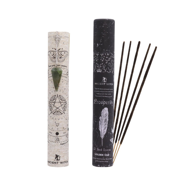 The Prosperity Spell Incense är en ritual i tubform, skapad för att bjuda in flöde, tillit och överflöd på flera plan. Setet innehåller tolv rökelser med fräsch, grön örtig doft, en pendel i grön aventurin samt en spådomskarta – allt stilfullt förpackat i ett tryckt rör med modern spirituell design.