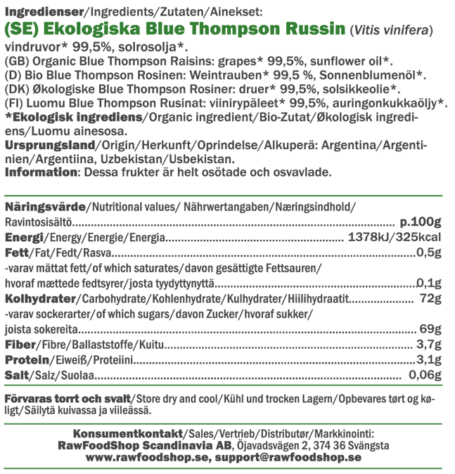 Ekologiska Blue Thompson-russin är mörka, söta russin som kommer från noggrant utvalda och mogna druvor. Dessa ekologiska russin är helt naturliga, utan tillsatt socker eller konstgjorda tillsatser. Med sin rika smak och fylliga textur är de perfekta att avnjutas som de är – direkt ur påsen – eller som ett härligt inslag i din favoritgranola. Oavsett om du vill ha något gott att äta på språng eller behöver en extra touch till din hemlagade bakning, är dessa russin ett utmärkt val.
