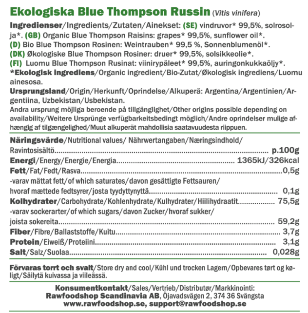 Ekologiska Blue Thompson-russin är mörka, söta russin som kommer från noggrant utvalda och mogna druvor. Dessa ekologiska russin är helt naturliga, utan tillsatt socker eller konstgjorda tillsatser. Med sin rika smak och fylliga textur är de perfekta att avnjutas som de är – direkt ur påsen – eller som ett härligt inslag i din favoritgranola. Oavsett om du vill ha något gott att äta på språng eller behöver en extra touch till din hemlagade bakning, är dessa russin ett utmärkt val.
