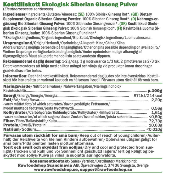Siberian Ginseng Pulver EKO är ett ekologiskt kosttillskott i pulverform av 100% Sibirisk Ginseng-rot (Eleutherococcus senticosus). Denna växt kallas även för rysk rot. Kosttillskottet har blivit till ett fint pulver genom en skonsam torknings- och malningsprocess där rotens naturliga karaktär har bevarats, vilket gör det enklare att ta del av i vardagen.