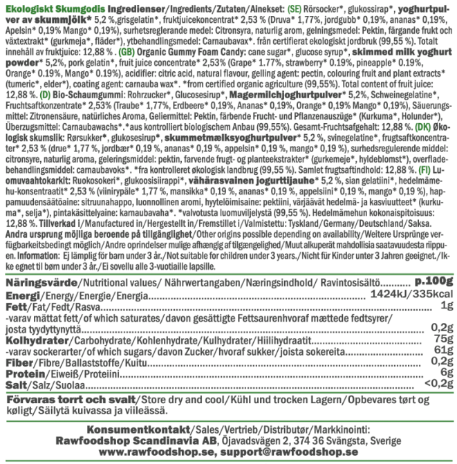 Oavsett om det är fredagsmys, en picknick eller ett barnkalas passar detta ekologiska skumgodis utmärkt. Förpackningen på 100 gram är lätt att ha med och praktisk att dela med familj och vänner – eller att njuta av själv för en stunds vardagslyx. Med yoghurt gums som smälter i munnen och en subtil smak av frukt är varje tugga en liten påminnelse om hur gott och naturligt godis kan vara. Välj vårt ekologiska skumgodis för en smakfull och omsorgsfullt framtagen godsak som gör varje tillfälle lite roligare och lite godare!