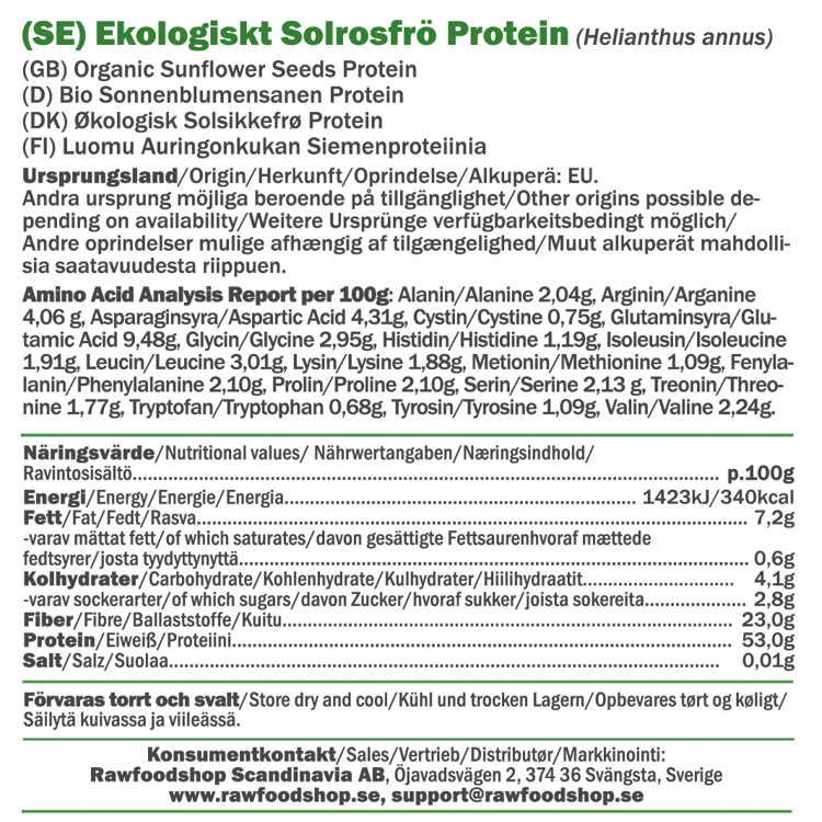Solrosfrö Protein EKO – ett ekologiskt och veganskt proteinpulver som ger dig ett naturligt sätt att komplettera din kost. Tillverkat av noggrant utvalda solrosfrön, är detta veganska proteinpulver ett utmärkt produkt för dig som vill ha en mångsidig ingrediens i din matlagning. Med sin milda smak och fina konsistens passar solrosprotein i många sammanhang. Du kan enkelt tillsätta det i allt från juicer och soppor, till att använda det i exempelvis smoothies och energibars.