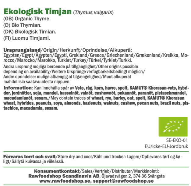 Den ekologiska torkade timjanen har lång hållbarhet och behåller sin arom, vilket gör den till ett självklart val i varje kök. På så vis får du ett naturligt och hållbart sätt som lyfter smakerna i dina rätter. Den här kryddan passar utmärkt i allt från grönsaksrätter och pastasåser till rustika soppor. Vill du laga mat med rena smaker från Medelhavet är denna ekologiska timjan rätt val. Smakrik, hållbar och alltid redo att ta plats i dina mest kreativa maträtter – från vardag till fest.
