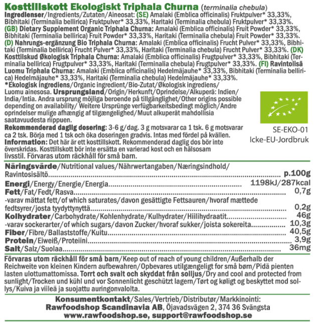 Triphala Churna EKO är ett ekologiskt, veganskt kosttillskott bestående av en blandning med frukterna Amalaki (Emblica officinalis), Bibhitaki (Terminalia bellirica) och Haritaki (Terminalia chebula). Triphala Churna används inom ayurveda. Genom att kombinera dessa tre komponenter får du ett veganskt kosttillskott av hög kvalitet, framtaget utan några som helst tillsatser.